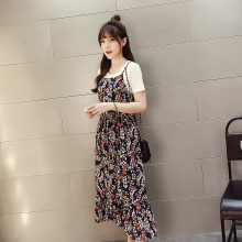 2017夏装韩版背带雪纺连衣裙气质两件套时尚高腰碎花半身裙子套装