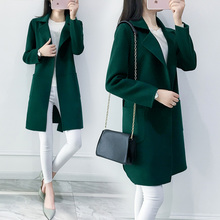 2016新款女装冬修身中长款毛呢外套女西装领系带收腰墨绿色呢大衣