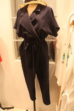 韩国东大门2017春夏新款气质显瘦系带翻领条纹短袖连体裤女