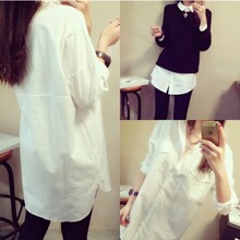 东大门17春装新款韩版V领中长款长袖白衬衫 女 宽松百搭衬衣