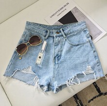 AHY韩版下摆毛边高腰破洞牛仔裤女夏宽松显瘦侧边粉条短裤热裤潮