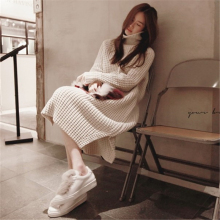 秋冬季加厚高领套头毛衣长裙韩国宽松长款开叉粗毛线针织连衣裙女