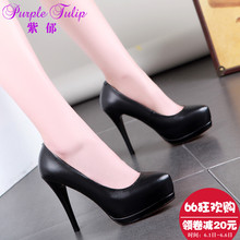 紫郁春秋季新款真皮深口单鞋女黑色高跟鞋细跟圆头防水台裸靴女鞋