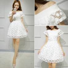 专柜同款2017夏新款镂空一字领短袖露肩绣花贝壳刺绣纯色连衣裙