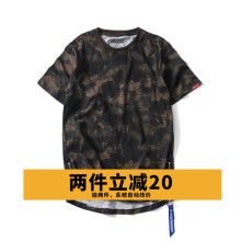 STR美式高街开叉挂带 街头夏日短袖T恤男迷彩圆领情侣半截袖TEE潮