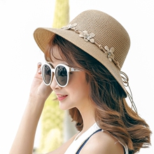 包邮 草帽子 女 夏天玫瑰花朵圆顶帽 韩版沙滩帽 草编遮阳帽短檐