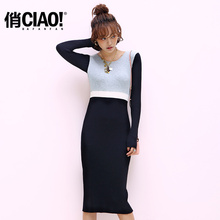 CIAO俏女秋季新款欧美长袖针织圆领连衣裙 修身撞色拼接性感裙子