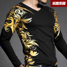 秋冬季潮男修身烫金印花T恤纯棉v领长袖体恤保暖男装时尚衣服小衫
