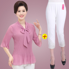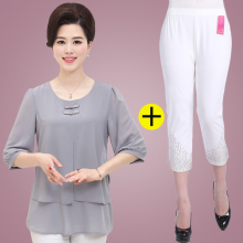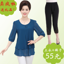 中老年女装夏季短袖雪纺套装上衣裤子两件套40中年妇女妈妈装套装