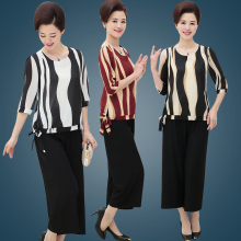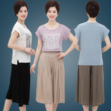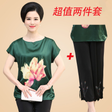 中老年女装夏装短袖套装40妈妈装两件套雪纺衫T恤阔腿裤休闲套装