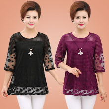 中老年女装夏装短袖t恤蕾丝衬衫妈妈装雪纺衫衬衣中长款大码上衣