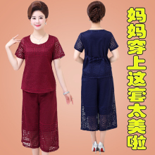 中老年女装两件套蕾丝短袖T恤40-50岁中年妈妈装夏装阔腿裤套装潮