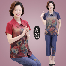 新款中老年女装夏装短袖t恤妈妈装夏季上衣中年雪纺衫套装两件套