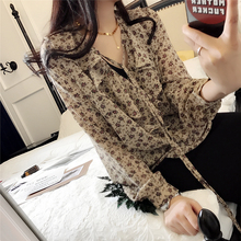 2017春季新款韩版宽松V领上衣系带碎花潮衬衫印花长袖雪纺衫女夏