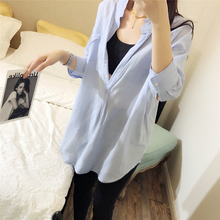 2017春夏新款大V领口袋条纹中长套头衬衫七分袖大码宽松女装上衣