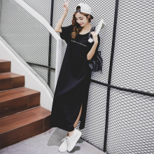 包邮韩版夏装宽松大码长款时尚休闲开叉摆圆领短袖T体恤裙女纯棉
