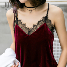 黎贝卡同款 丝绒打底吊带背心女百搭 性感蕾丝拼接睫毛打底衫