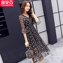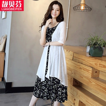欧根纱连衣裙女中长款2017夏季新款仙韩版修身两件套雪纺套装裙子