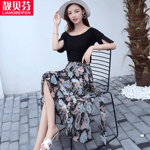 连衣裙女2017春夏新款韩版绷带T恤印花雪纺半身裙百搭套装两件套