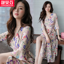 碎花连衣裙女2017夏季新款韩版修身显瘦V领雪纺中长款沙滩裙长裙