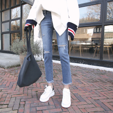 春夏新品高腰蓝色九分破洞小脚牛仔裤女黑色铅笔裤膝盖磨破9分裤