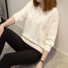 春季新款韩版V领蝙蝠衫毛衣女外套七分袖套头短款上衣镂空针织衫