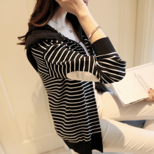 新款春装拉链带帽针织开衫长袖条纹学生毛衣外套女宽松棉打底卫衣