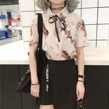 韩国ulzzang夏季新款可爱学院风小狗印花蝴蝶结系带短袖衬衫上衣