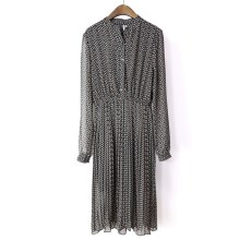 韩国代购2016春装复古小碎花印花百褶雪纺连衣裙中长裙女