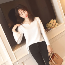 纯色大圆领小开口薄款针织衫喇叭袖垂感显瘦撕边T恤女打底衫小衫