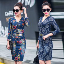 2017春夏新韩版中长包臀打底裙子修身V领印花休闲牛仔棉连衣裙女