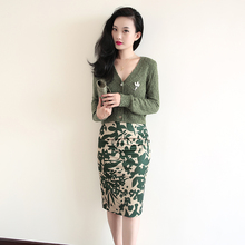 莫凝春季套装女裙装欧美性感修身显瘦气质印花两件套 针织衫+半裙
