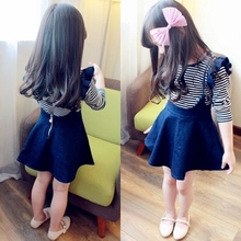 童装2017春秋季新款韩版潮女童儿童休闲条纹长袖T恤+背带裙两件套