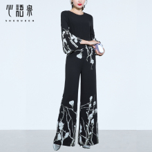 心语泉2017春夏新款女装时尚雪纺阔腿裤气质连体衣黑色印花连衣裤