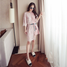 东大门夏装新款蕾丝拼接不规则中长款A字裙短袖宽松腰带连衣裙潮