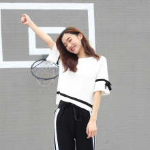 韩版宽松套头半袖女春夏前短后长上衣冰丝黑白条纹短款中袖针织衫