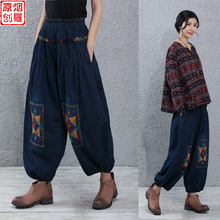 烟罗包邮原创民族风秋冬女裤刺绣松紧腰灯笼裤阔腿裤九分裤牛仔裤