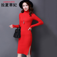 秋冬季新品韩版女装中长款高领打底针织衫开叉修身长袖套头毛衣女