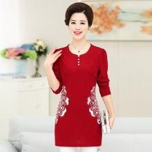中老年女装春装长袖t恤妈妈装印花宽松百搭时尚中长款上衣内搭