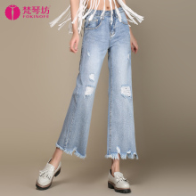 梵琴坊2017夏季九分裤破洞牛仔阔腿裤女大码宽松微喇叭毛边乞丐裤