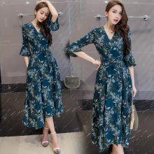 雪纺碎花连衣裙女春夏季2017韩版时尚气质显瘦v领喇叭袖沙滩长裙
