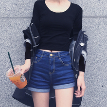 秋冬款纯棉女短款紧身小圆领韩版修身上衣长袖T恤黑色显瘦打底衫