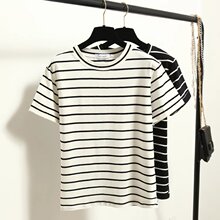 17夏季新款日系小清新黑白条纹圆领短袖T恤女宽松纯棉打底衫上衣