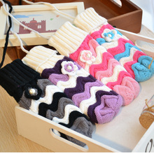 韩全指手套女冬季波浪拼色小花针织毛线手套加绒加厚保暖连指包套