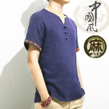 夏季亚麻短袖T恤男宽松透气上衣胖子加肥加大码棉麻布民族风体恤