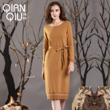 浅秋官方正品早春新品圆领收腰中长款加厚羊毛针织连衣裙打底裙