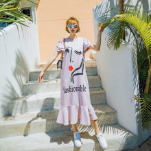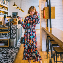 古拉良品2017春装新款雪纺裙显瘦复古波普印花裙荷叶边鱼尾连衣裙
