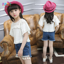 童装女童夏装2017新款韩版中大童运动小女孩蕾丝牛仔短裤两件套装