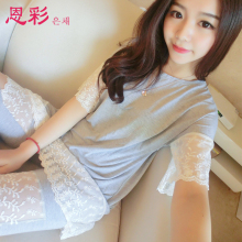 新款春夏季休闲短袖棉质睡衣裤套装少女士可爱蕾丝性感韩版家居服