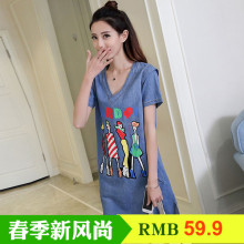 夏装新款韩版V领宽松印花甜美休闲短袖学生做旧破洞牛仔连衣裙女